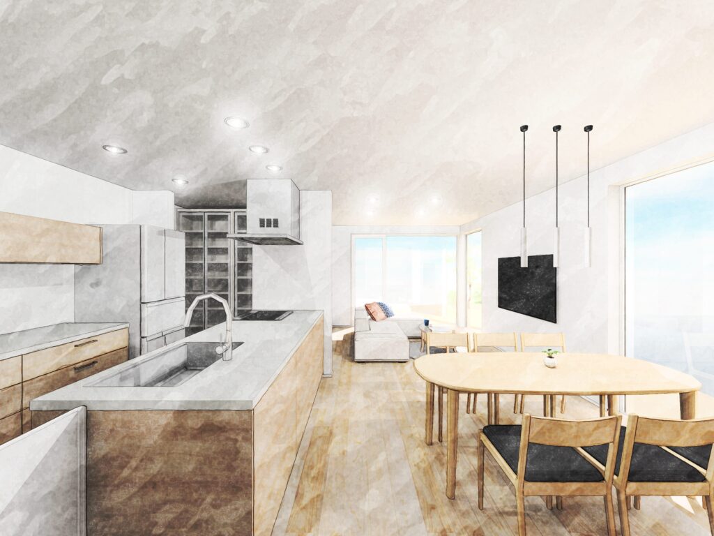 ゆとりある大きなパントリーを備え、民泊やカフェのようにゲストを迎えることも想定した設計です。