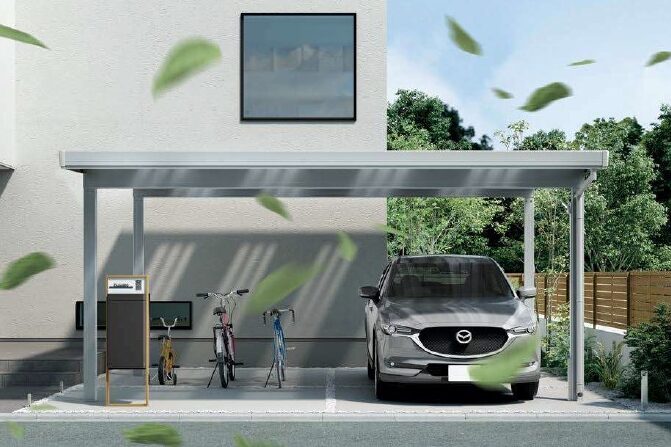 建物と調和するデザインのカーポートは、住まい全体の印象を引き締め、外観にさらなる上質さと存在感をプラス。機能性にとどまらず、住まいの格を一段引き上げる外構です。